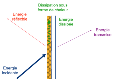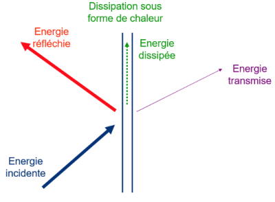 Rapport entre la quantité d’énergie non réfléchie (transmise et absorbée) sur la quantité d’énergie incidente. Il caractérise les performances d’une paroi à absorber les sons. Compris entre 0 et 1, le coefficient d’absorption se note α. Plus ce coefficient est proche 1, plus l’énergie incidente sera absorbée. Et inversement, plus il se rapprochera de 0 plus l’énergie incidente sera réfléchie.