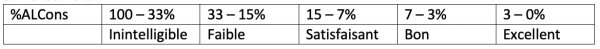 Méthode de mesure de l’intelligibilité basée sur le calcul du pourcentage de consonnes inaudibles. Les consonnes jouent un rôle plus déterminant que les voyelles dans l’intelligibilité de la parole. Si les consonnes sont clairement entendues, il est plus facile de comprendre la parole dans son ensemble.