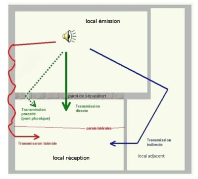 Transmission par des éléments singuliers (gaines techniques, entrées d’air, coffres de volet roulant, défauts et malfaçon). L’interphonie par les réseaux de ventilation est considéré comme une transmission parasite entre deux locaux.